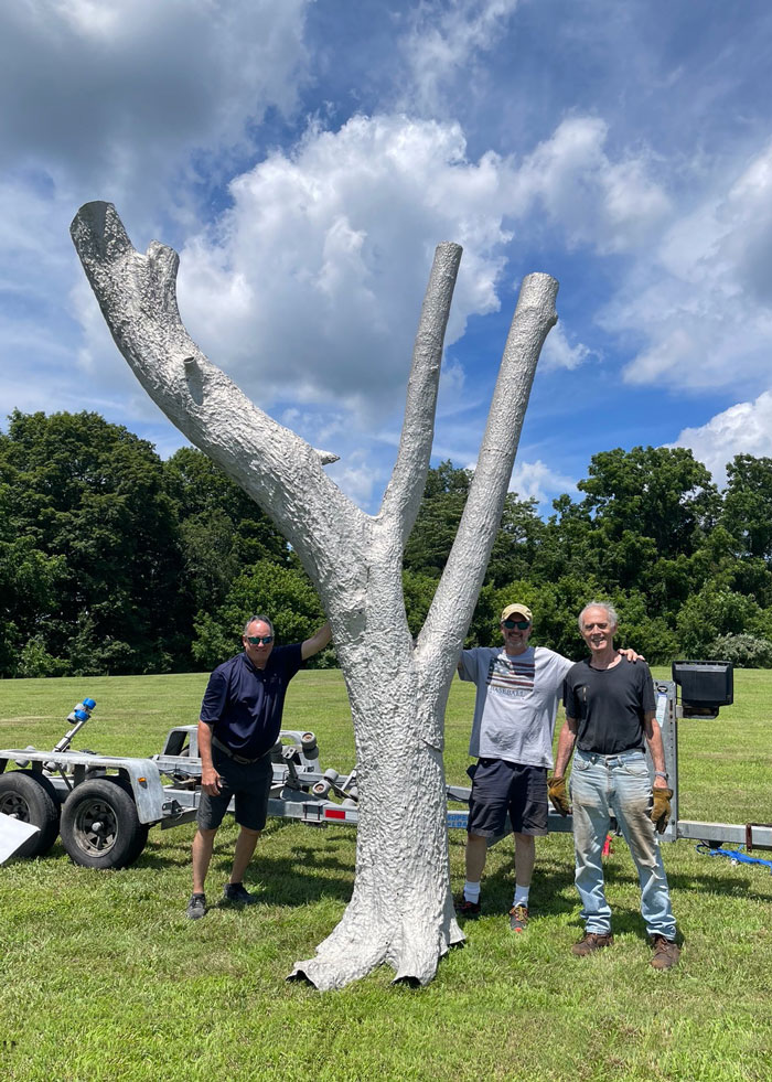 The form was molded from a tree with heat-treated hammered aluminum alloy by sculptor Bob Lobe. For fifty years, Lobe has created sculpture from the remote forest models along the Kittatinny Ridge in Sussex County. For an artist walking in these woods, the earth gushes a torrent of shapes and forms, angles and curves, textures and light, all vibrantly alive, yet frozen in a rhythm of life far different than our own. Lobe started employing pneumatic tools in 1985, hauling an air compressor through the woods to facilitate stretching and shrinking the metal, encapsulating landscape. "Most of the work is setting up; the actual tooling goes very rapidly," Lobe explains. "I know what's going to happen. It's like dress making." With the hammer, he gathers the metal around the form, adding texture, which expands the surface area of the aluminum sheet.