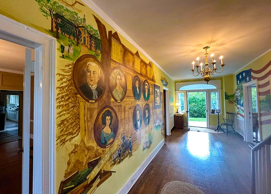 At the heart of the estate stands the 18th-century farmhouse, a blend of Federal and Georgian architecture that has seen countless alterations over the centuries. “In many ways, that house is an example of what wealthier people could do to change things around,” says Becker. “The entrance you see today used to be the back of the house until it was reoriented in the 1940s.” By the time of Edmund Ross’s passing, the house needed major rehabilitation. Its revival began in 2006, when the Women’s Association for Morristown Medical Center chose it for the Thirteenth Mansion in May Designer Showcase, for which the organizers cleaned, updated, and repurposed the space. “They didn’t put house precisely back to the way it was, but they did make it more usable, cleaned it up and gave us a good base of a multi-use space on all three floors,” remarks Becker. Remnants of the designers’ work still accentuate the décor through much of the house, and many of the rooms are outfitted with furniture and items donated by the community. A center-hall mural, recently completed by artist, Michelle Cirotti, chronicles the estate’s families and its ongoing legacy. There are portraits of Boudinot, his wife and daughter; Henry Southard, his wife and sons Samuel and Isaac, and a family portrait of Edmund and Margaret Ross with their five children. Along the opposite wall are depictions of the Giving Garden, the property entranceway, and the farm’s barn.