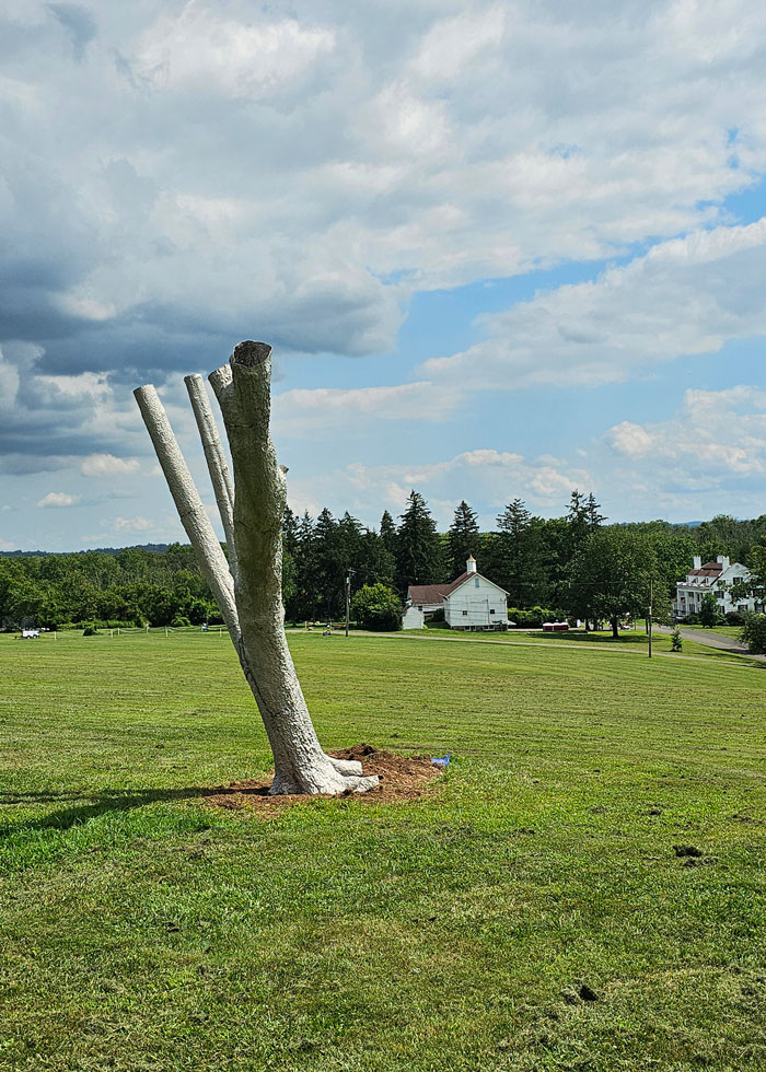 In the farmyard rests a piece of famous 600-year-old white oak that, until 2017, stood in the Presbyterian Churchyard in Basking Ridge, a remnant of the vast thick forests that long ago gave way to the agricultural domain of the Garden State. Beyond the farmyard, fields once tilled for crops and grazed by horses remain as a vast open lawn that rises from the barnyard to the crest of a knoll crowned by a sculpture posed like a ballerina looking across to the forest edge.